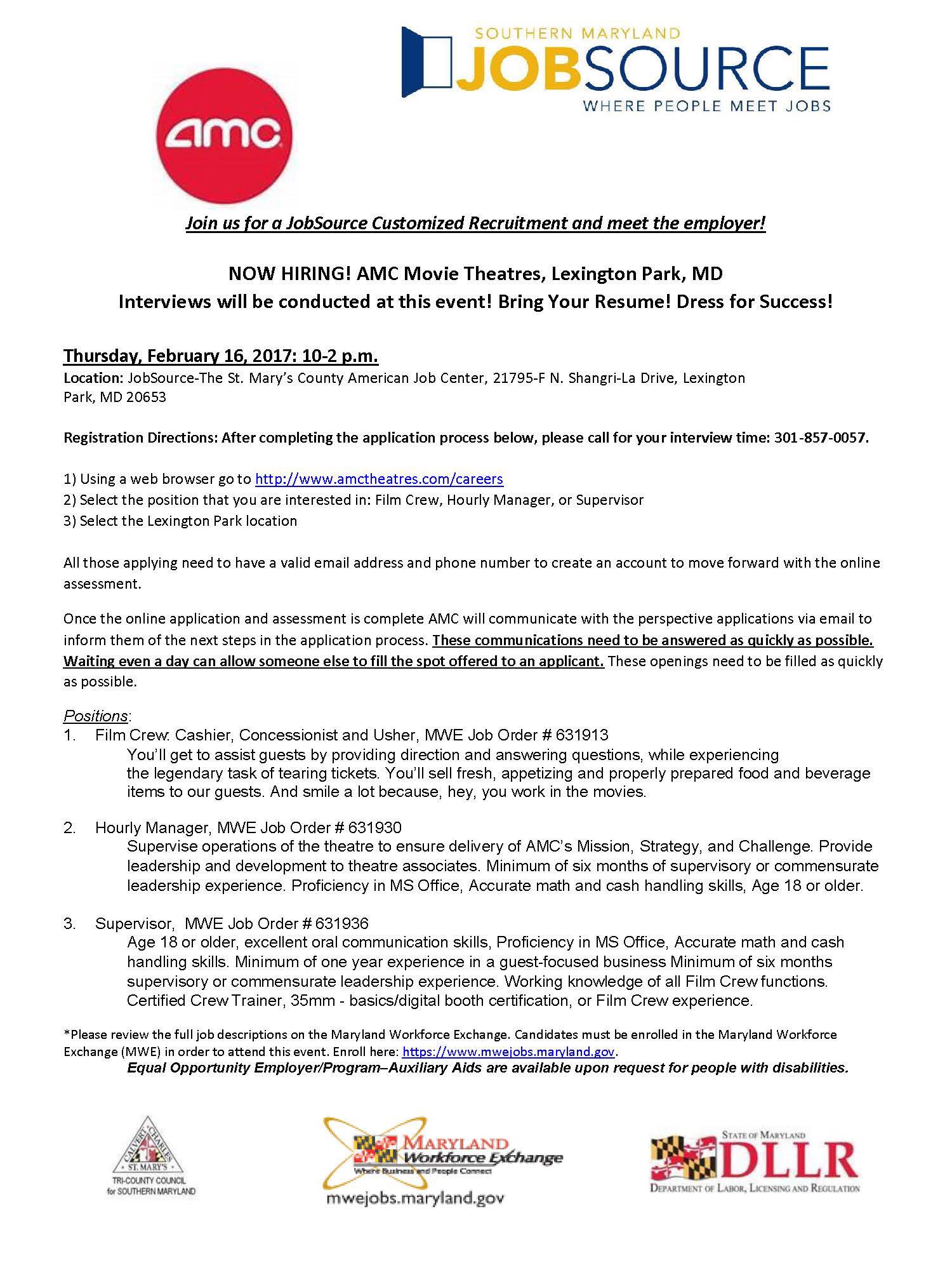 Md Department Of Labor Di Twitter Hiring Amc Movie Theatres In Lexington Park Md Will Be Conducting Interviews On Thurs 2 16 From 10am 2pm Learn More Https T Co Mzpart5ekw Twitter